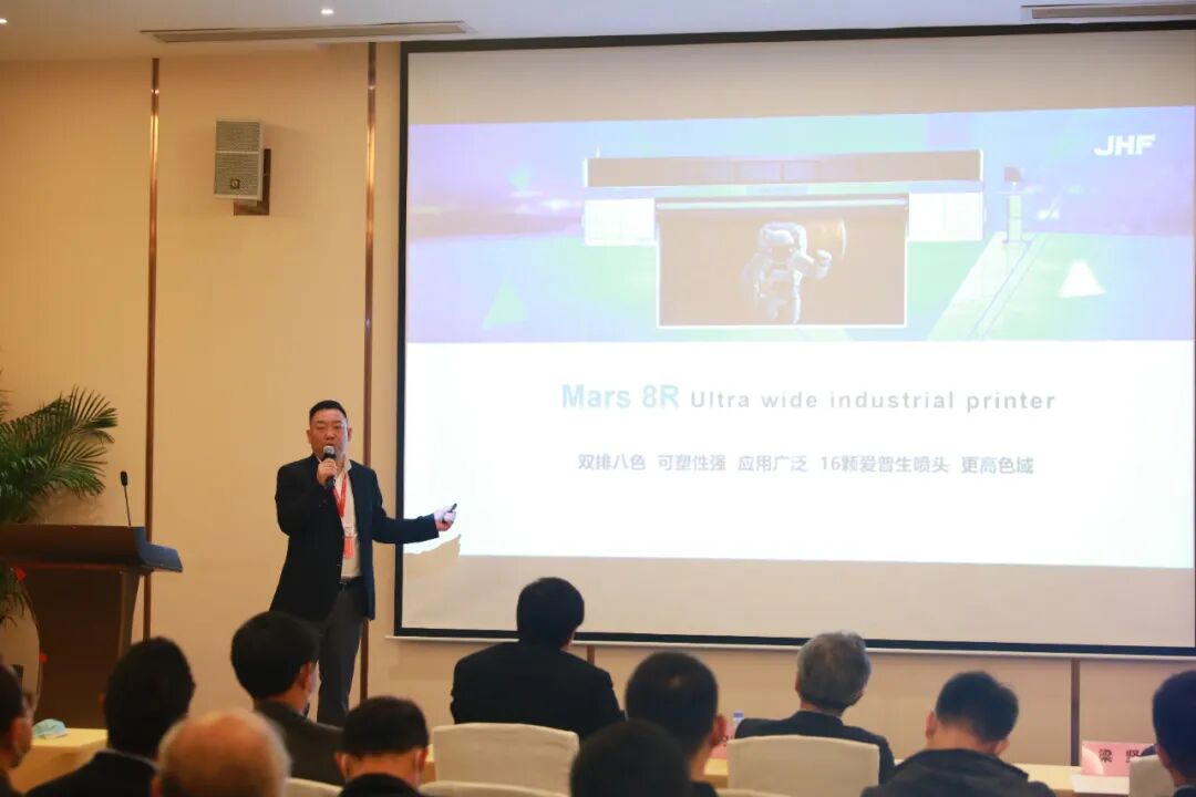 随后,爱普生(中国)有限公司专业打印业务总监内田康彦先生、工业喷墨经理梁坚先生、技术部长高岳先生分别上台致辞。广州市保轩展览有限公司总经理孙东伟先生、《画媒》传媒总经理蔡尚文先生、常州霍克展示系统股份有限公司董事长孙晓球先生分别发表了主题演讲。论坛过程中,金恒丰科技集团副总裁孙光明先生向现场嘉宾详细介绍了金恒丰在广告图像领域的匠心之作Mars8R超宽幅工业打印机,帮助客户对Mars8R的性能以及应用解决方案有更深入的了解。