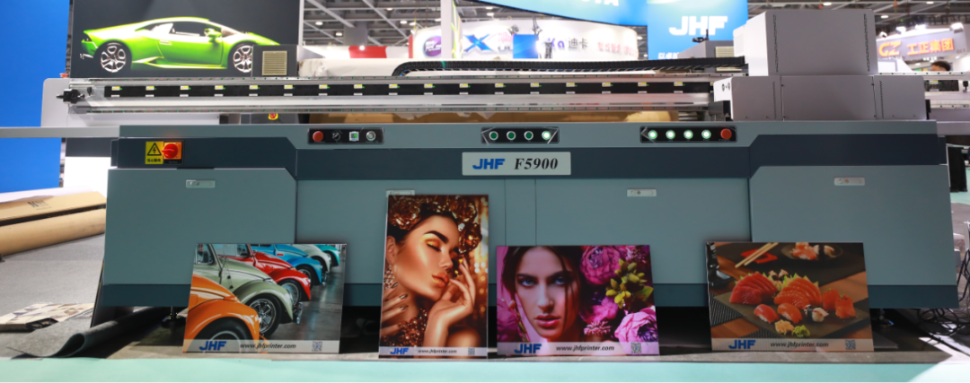 同步亮相的JHF F5900超宽幅工业平板打印机搭载了工业级Epson喷头,以更高精度为高品质影像级输出形成强有力的保障。整机采用自动车头升降系统和定制电机,保障平台全程定位精准控制,可实现任意位置不同高度的打印,实现工业化、自动化生产。通过可变墨滴技术,确保在高速运行状态下,在纸板、瓦楞板、PVC、灯箱片、木板、玻璃、瓷砖等多种介质上呈现完美的打印效果。